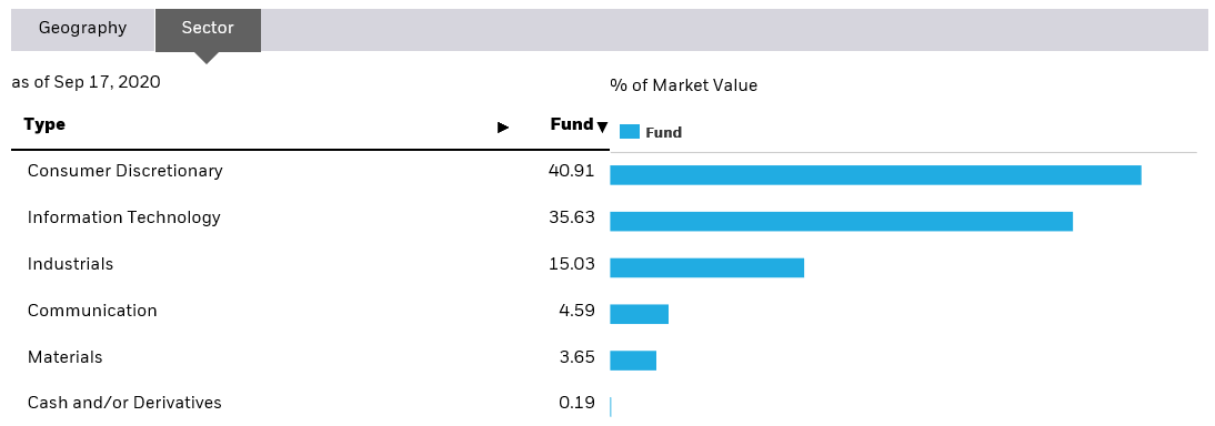 미국 기업이 포트폴리오의 50% 정도를 차지하고 있고, 독일, 일본, 한국 기업이 10%내외의 비율을 보이고 있습니다. 섹터별로는 전기차도 결국 자동차이기 때문에 소비재의 비중이 높게 나오고 그 뒤를 IT가 뒤따르고 있습니다. (애플은 소비재로 들어가는지 IT로 들어가는지 모르겠습니다..)
