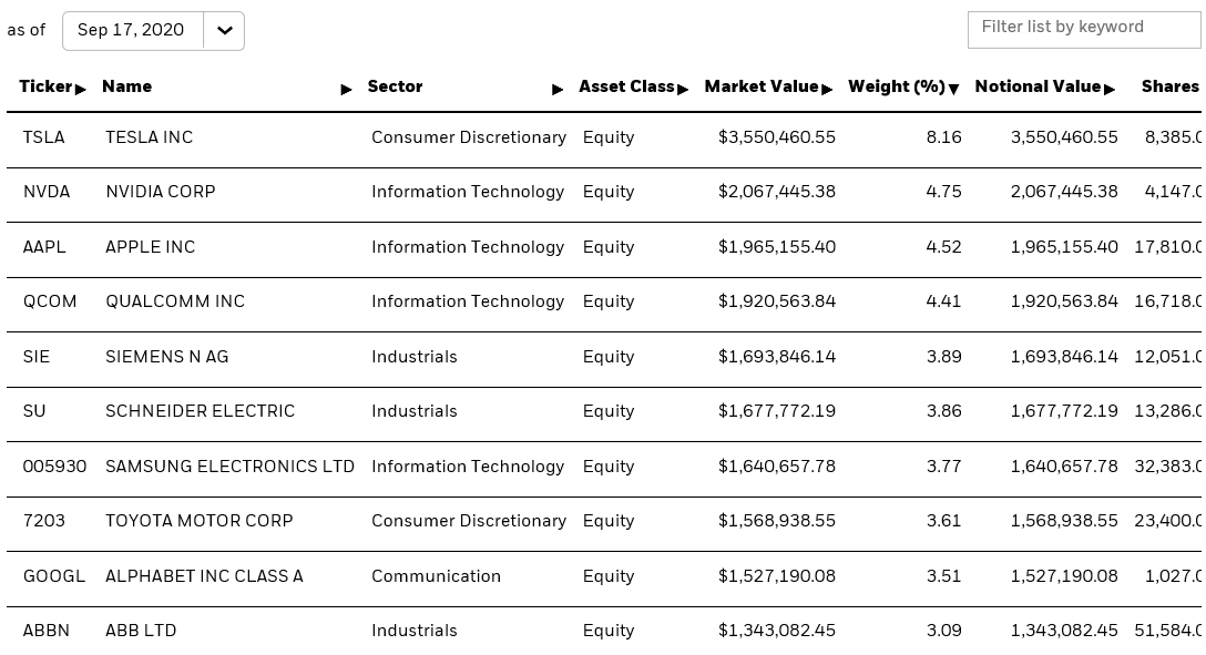 - 섹터와 지역을 아울러 자율 주행 및 전기차 산업의 전체 밸류 체인 글로벌 주식에 노출시킨다.