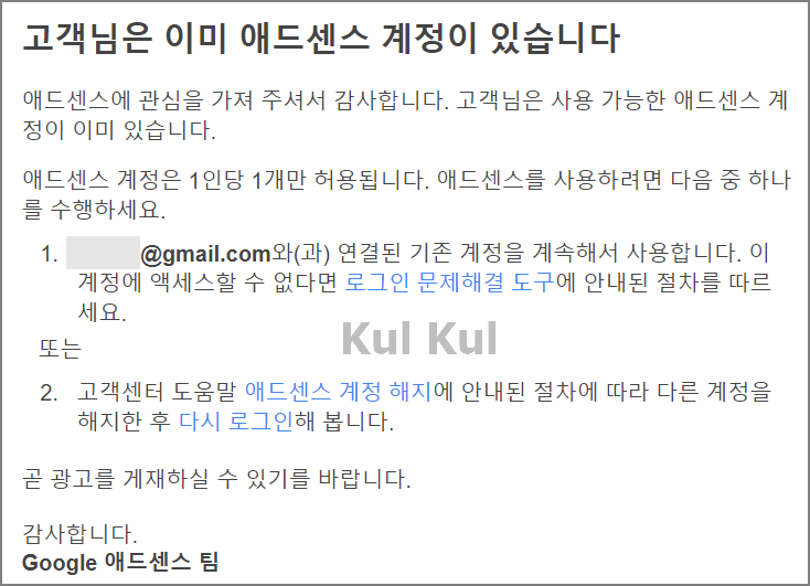 이미 제가 다른 구글 계정으로 애드센스에 가입되어 있으니, 그 계정을 사용하던가 아니면 기존 구글 계정으로 가입한 애드센스를 해지하라는 내용이었습니다.