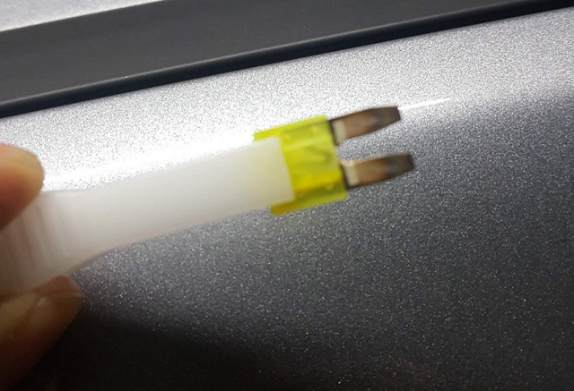 기존에 꼽혀있었던 퓨즈를 뽑아보니 가운데 부분이 까맣게 타서 끊어져 있었습니다.