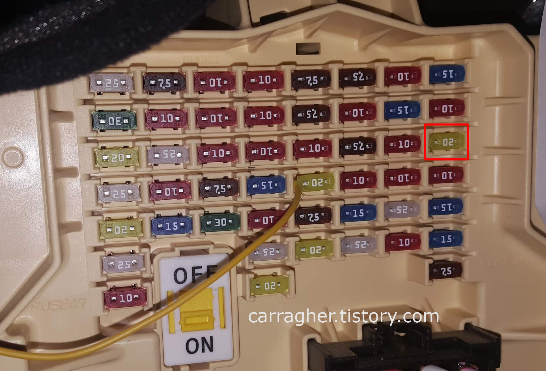 여기서 20A짜리 퓨즈(노란색)를 하나 꺼내서 아까 파워 아웃렛 위치의 퓨즈와 교체해줍니다.