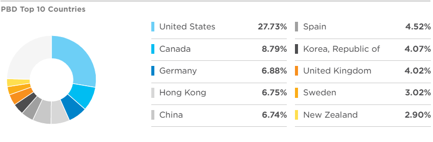 아래는 PBD를 구성하는 상위 비중 10개 기업인데, 상위 비중이라고 특별히 높은 퍼센티지를 가지고 있지 않습니다. 비중 순위 1위와 10위간의 비중 차이가 0.27%밖에 나지 않는 모습을 보이고 있습니다.