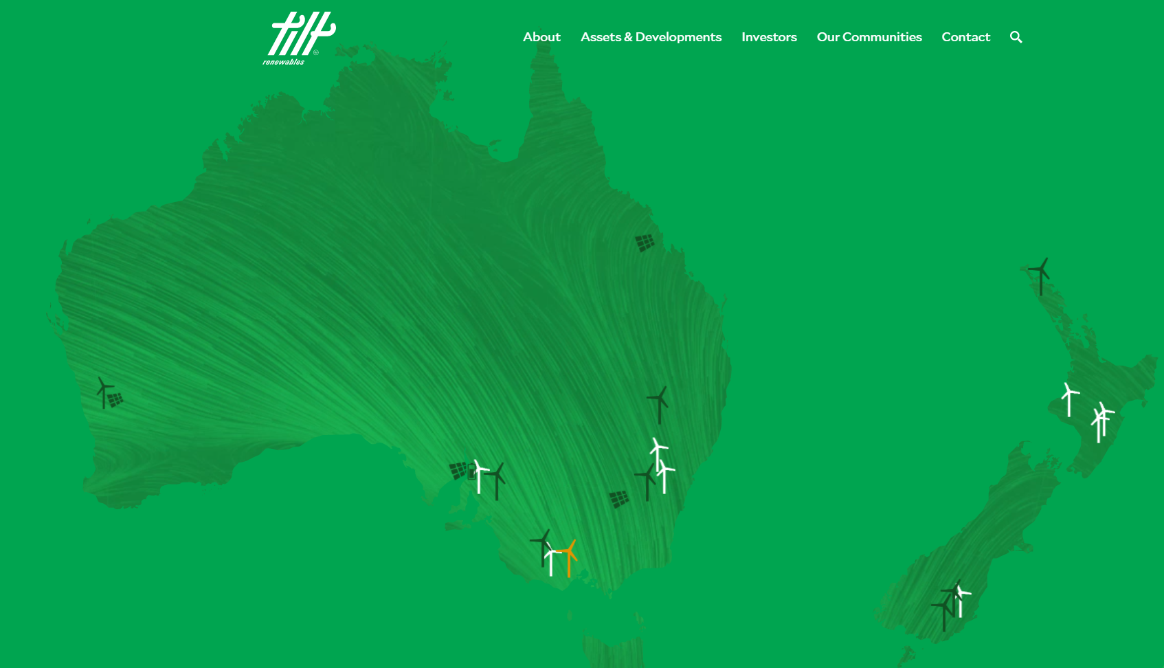 틸트 리뉴어블스 홈페이지를 방문하면 아래와 같이 이 회사의 발전 시설 위치가 나타나 있는데, 호주 및 뉴질랜드(주로 호주 남동부) 여러 지역에 태양광, 풍력 발전 시설이 있는 것을 알 수 있습니다.