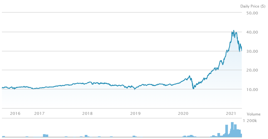 최근 5년 간의 가격 추이를 보면 계속 10달러 부근에서 머물다 2020년 3월에 코로나 팬더믹이후 유동성 장세, 전기차, 친환경 산업에 대한 관심, 바이든 대통령(당시 후보)의 공약 등으로 40달러까지 급격한 상승을 보였고, 2021년 최근에는 30달러까지 조정을 보인 모습입니다.