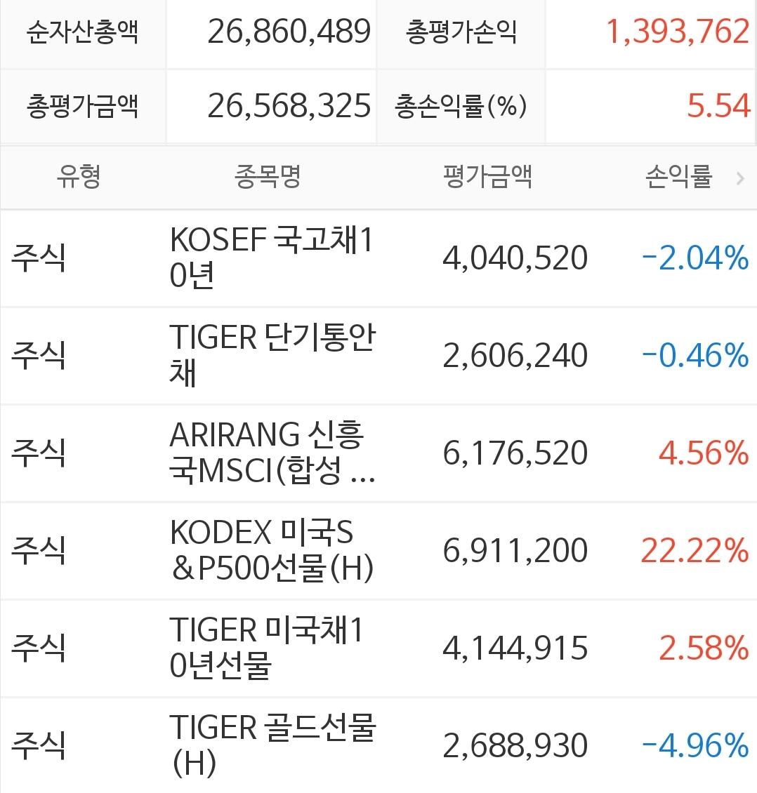리밸런싱 하기 전 MTS에서 캡쳐한 연금저축 내 자산 현황과 지난 1달간 각 자산의 변동률 그래프입니다.