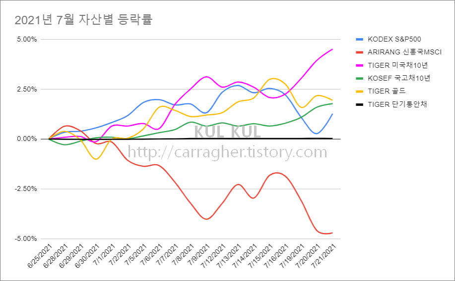 지난 5월에는 금이, 지난 6월에는 신흥국MSCI가, 그리고 이번에는 미국채가 순서대로 상승하는 보기 좋은 모습을 보여줬습니다.