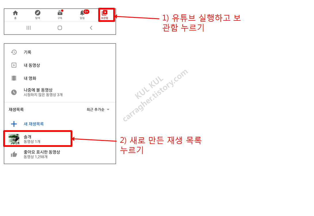 2. 보관함에서 밑으로 내리다보면 새로 만든 재생목록이 나옵니다. 새로 만든 재생목록을 누릅니다.