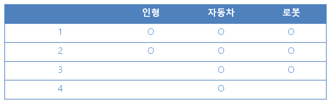 * 아이가 가진 장난감 종류를 표로 만들고 개수에 해당되는 만큼 'O' 표시