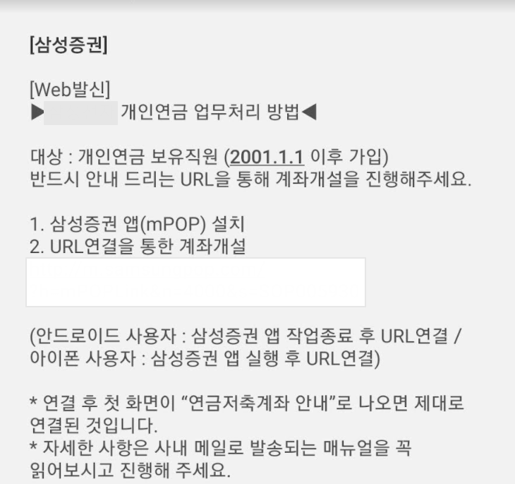 회사 인사 시스템을 통해 퇴직연금 변경 신청을 하니, 바로 다음 날 이전받는 증권사로부터 연금 계좌 개설하라는 문자가 바로 왔습니다.