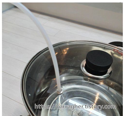 1. 테프론 호스의 한 쪽 끝을 냄비 뚜껑에 끼워줍니다. 6X4 사이즈의 호스를 사용하면 아래 사진과 같이 증기 구멍에 딱 맞습니다.