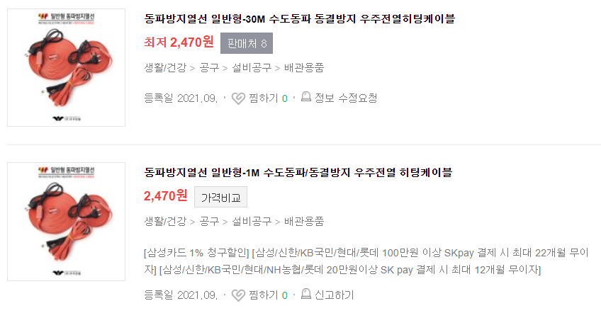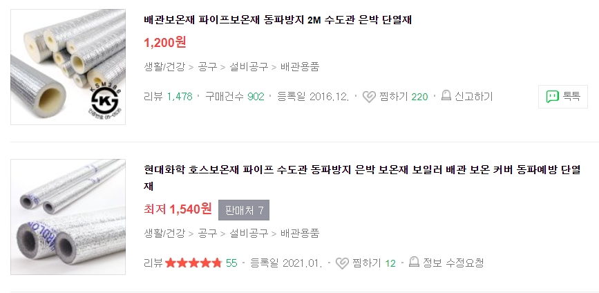 2. 동결이 예상되는 수도관에 단열재나 열선을 감아줍니다. 인터넷에서 '수도관 동결 방지 단열제', '동결 방지 열선'으로 검색하면 다양한 제품을 찾을 수 있습니다.