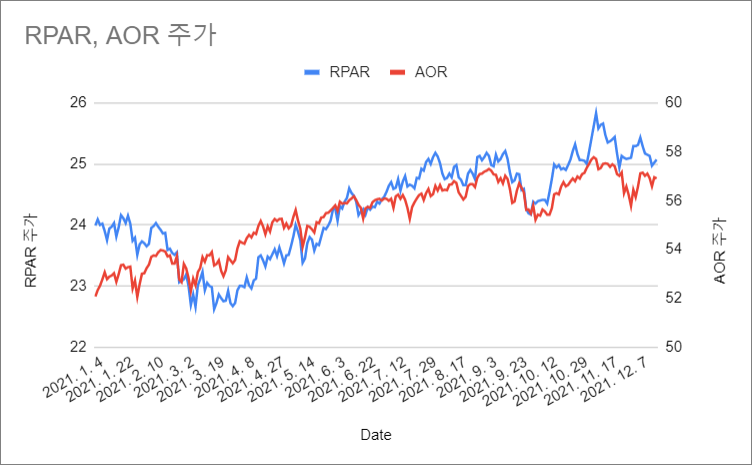왼쪽 세로축이 RPAR에 대한 주가를 나타낸 것이고, 오른쪽 세로축은 AOR의 주가에 대한 축입니다.