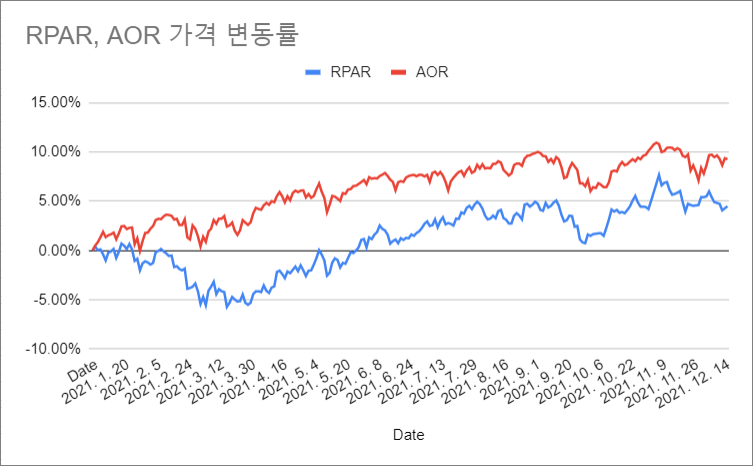 전체적인 주가 흐름은 비슷했는데, RPAR은 2~5월 사이에 AOR 대비 큰 하락을 겪은게 전체 수익률에 영향을 주었네요.