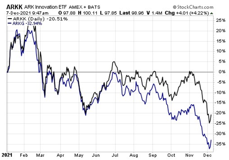 두 펀드의 연간 유입액은 ARKK가 50억 달러, ARKG는 16억 달러이지만 3월 이후 자금 유출액은 두 펀드가 각각 6억 5,500만 달러와 20억 달러를 기록하고 있다.