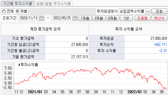 현재까지의 누적 수익률을 살펴보겠습니다. 지난 달 -0.12%에서 더 하락하여 -2.31%를 기록하였습니다. 두 달 연속 마이너스 수익률이네요. 그래도 최근 미국 나스닥, S&P500이 하락한 거에 비하면 선방한거라 위안을 가져봅니다.