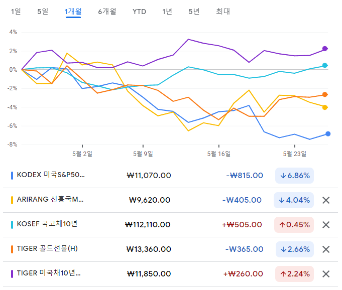 지난 달까지는 구글스프레드시트에서 자산변동률 그래프를 뽑았는데, 구글 파이낸스 사이트 (www.google.com/finance)에서도 쉽게 가격 변동 그래프를 얻을 수 있네요. (단, 최대 5개 종목까지 비교할 수 있어 TIGER 단기통안채는 그래프에서 제외했습니다. 어짜피 현금성 자산이라 가격 변동이 거의 없으므로...)