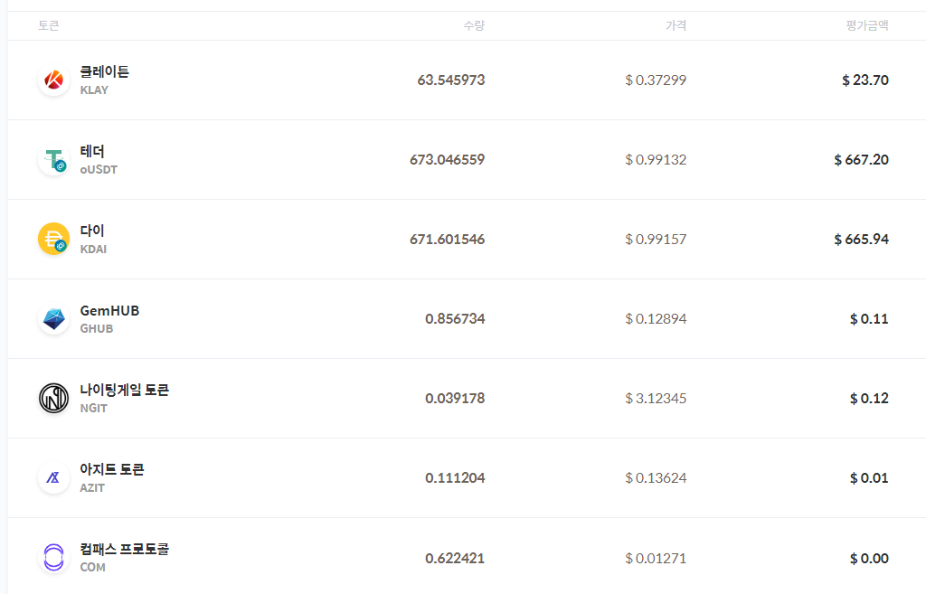 보상으로 받은 코인으로는 KSP(클레이스왑) 말고도 위의 캡처처럼 GHUB, NGIT, AZIT, COM가 있었는데, 보시는 것처럼 모두 1 달러가 채 안 되는 미미한 수량입니다.