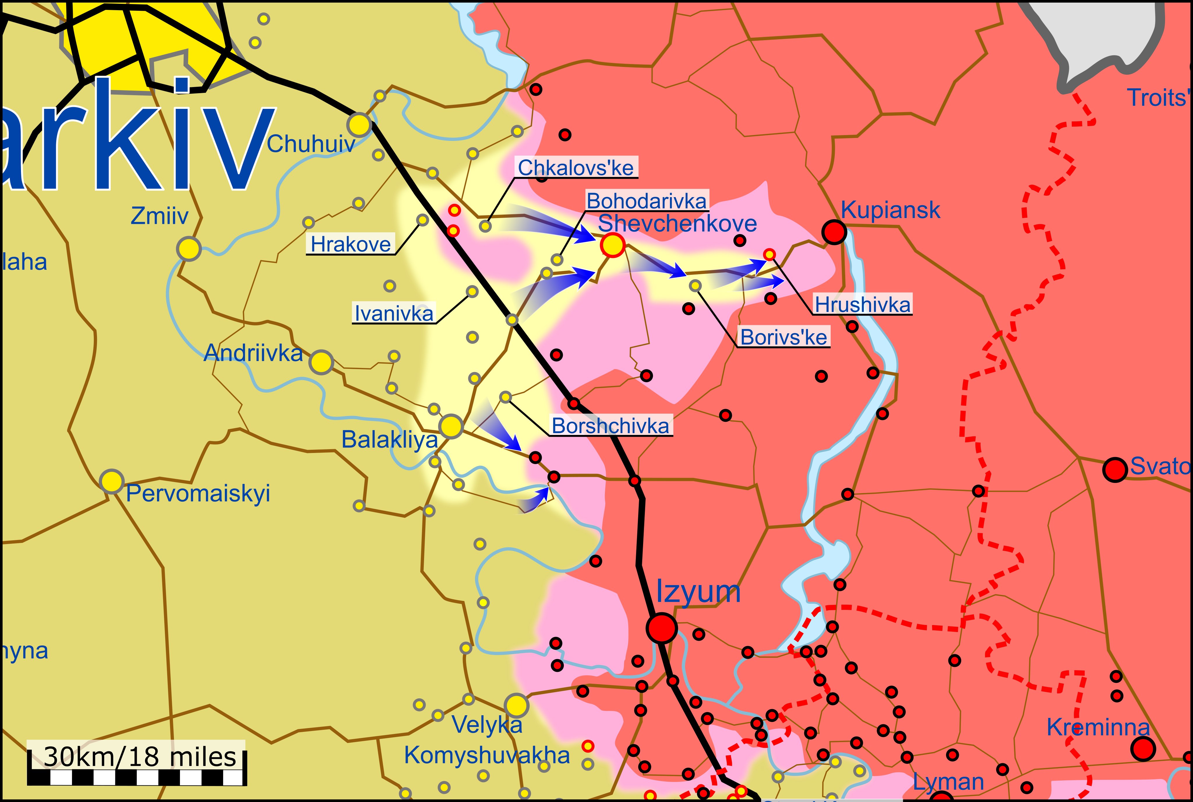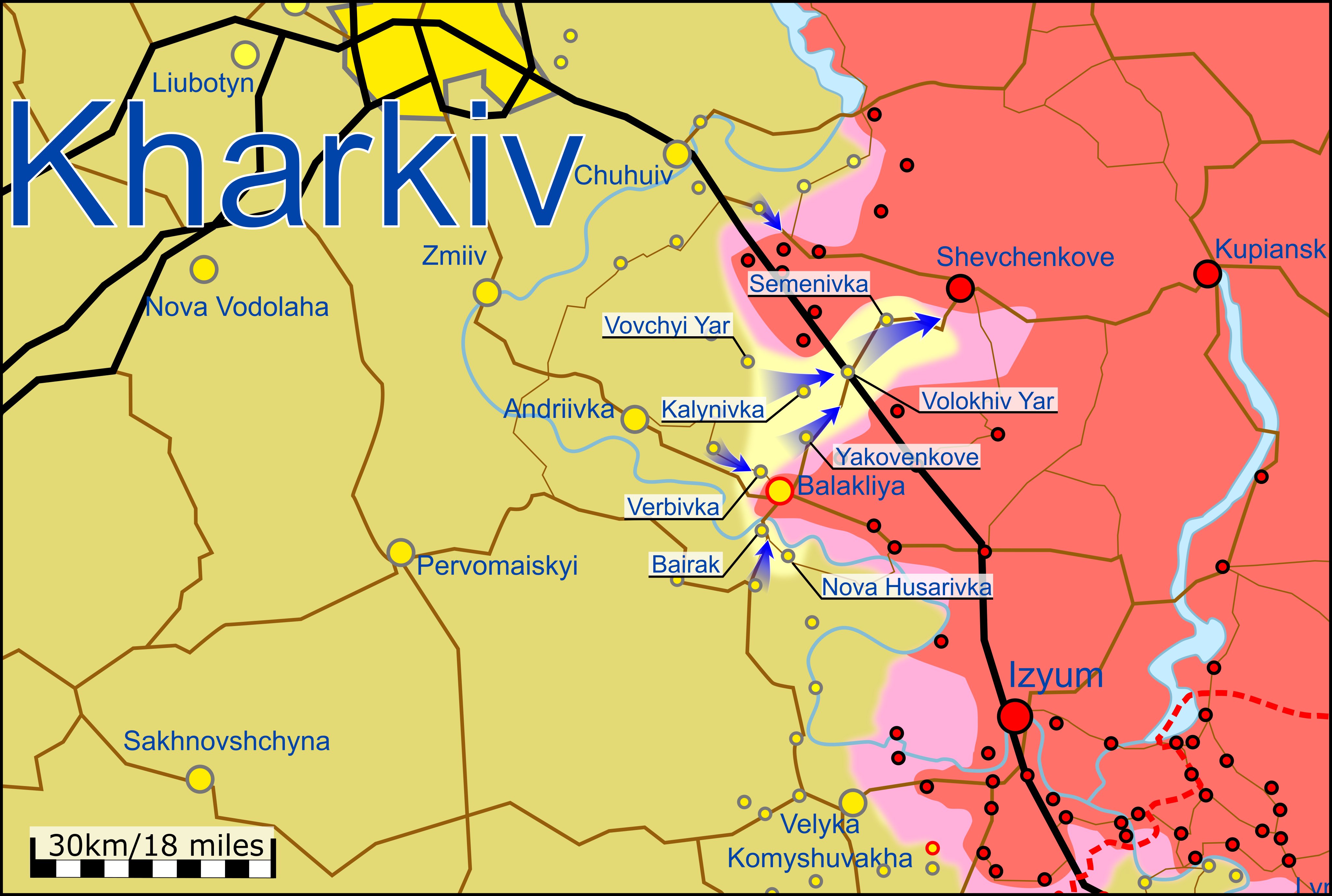 9월 9일, 우크라이나 군이 발라클리야(Balakliya), 보르쉬치우카(Borshchivka), 이바니우카(Ivanivka), 흐라코베(Hrakove), 치칼로우스케(Chkalovs’ke), 보호다리우카(Bohodarivka)를 해방시킴.