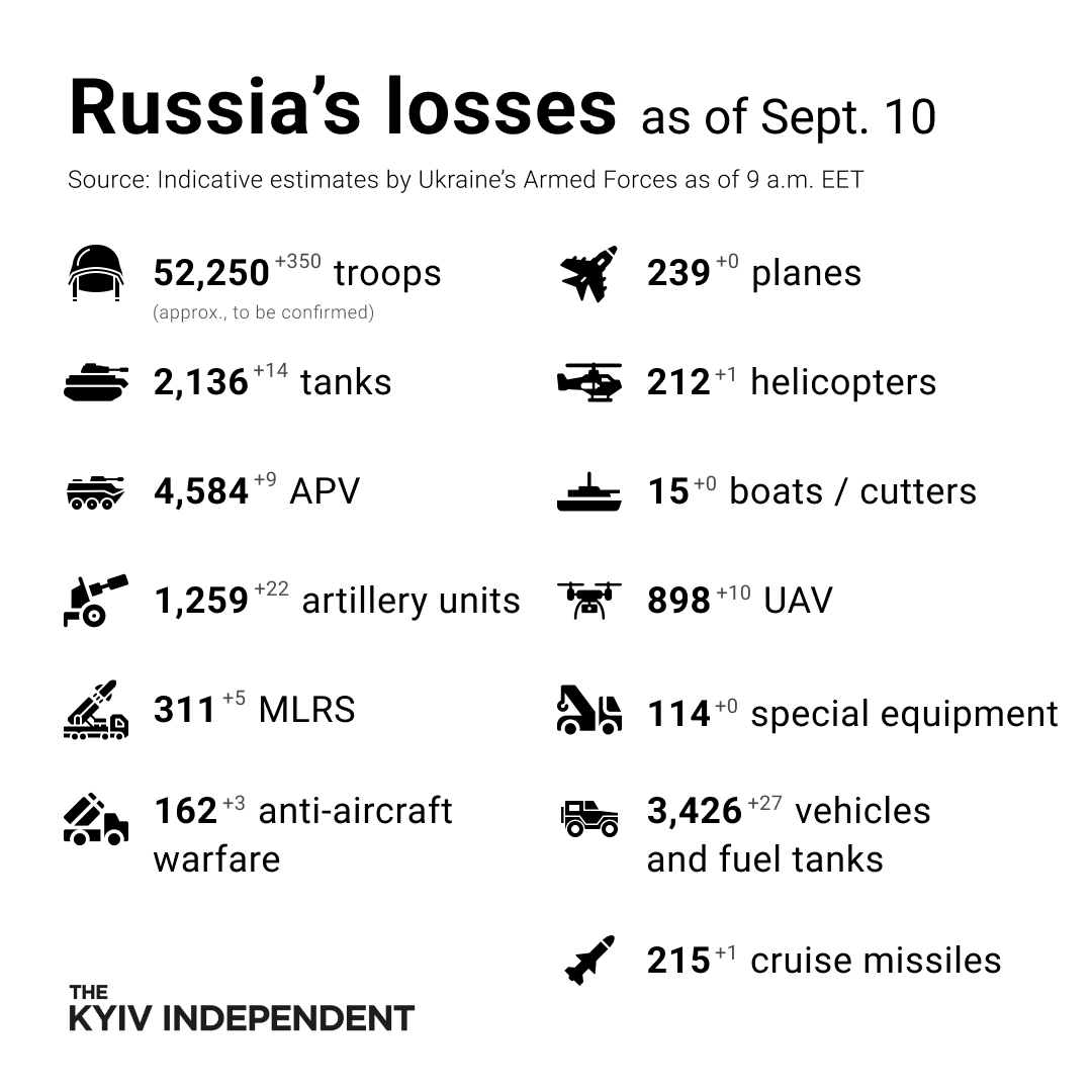 9월 8일, 우크라이나 군이 하르키우 주에서 진격하여 세메니우카(Semenivka), 볼로키우 야르(Volokhiv Yar), 보브치이 야르(Vovchyi Yar), 칼리니우카(Kalynivka), 야코벤코브(Yakovenkove), 바이라크(Bairak), 노부 후사리우카(Nova Husarivka) 지역을 해방시킴.