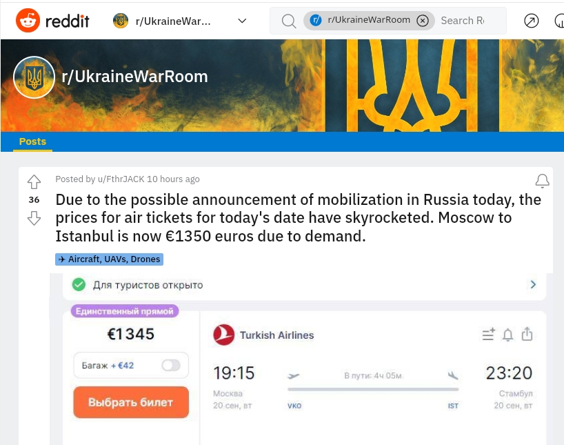 레딧의 모 포스트에서는 어제 동원령이 내려질 가능성이 있다는 소식에 모스크바발 이스타불행 비행기 가격이 폭등했다고 합니다. - 출처