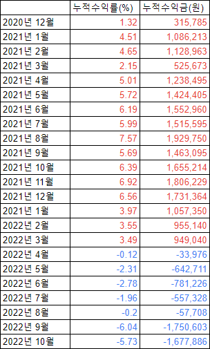 현재까지의 수익률입니다. 지난 달 -6.04%에서 본전에 조금 회복하여 -5.73%를 기록했습니다.