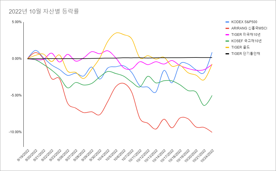 미국 S&P500은 다행히 월 말로 가면서 플러스(0.88%)로 마감했습니다만, 미국채(-0.76%), 국고채(-4.99%), 금(-0.71%)이 모두 마이너스를 기록해서 전체적으로 약세를 면치 못했습니다.