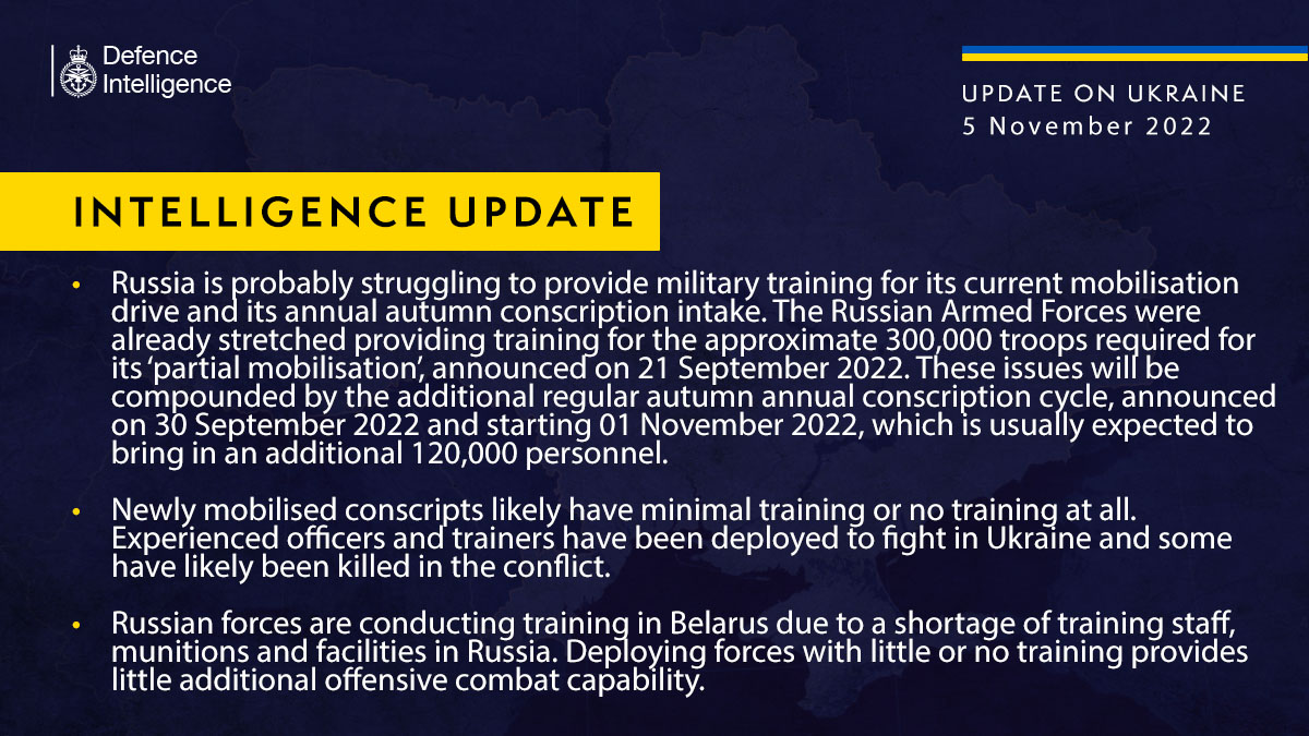 러시아는 아마 현재 동원된 인원과 연례적으로 가을에 징병되는 인원에 대한 군사 훈련에 어려움을 겪고 있을 것이다. 러시아군은 이미 2022년 9월 21일에 발표한 '부분적 동원령'에서 요구된 약 30만에 대한 훈련을 제공하느라 부담을 가진 상태이다. 이 이슈는 2022년 9월 30일에 발표되어 2022년 11월 1일부터 시작되는 추계 정기 징병 시기와 맞물리면서 더욱 악화될 것이고 12만명의 인원이 추가될 것으로 예상된다.