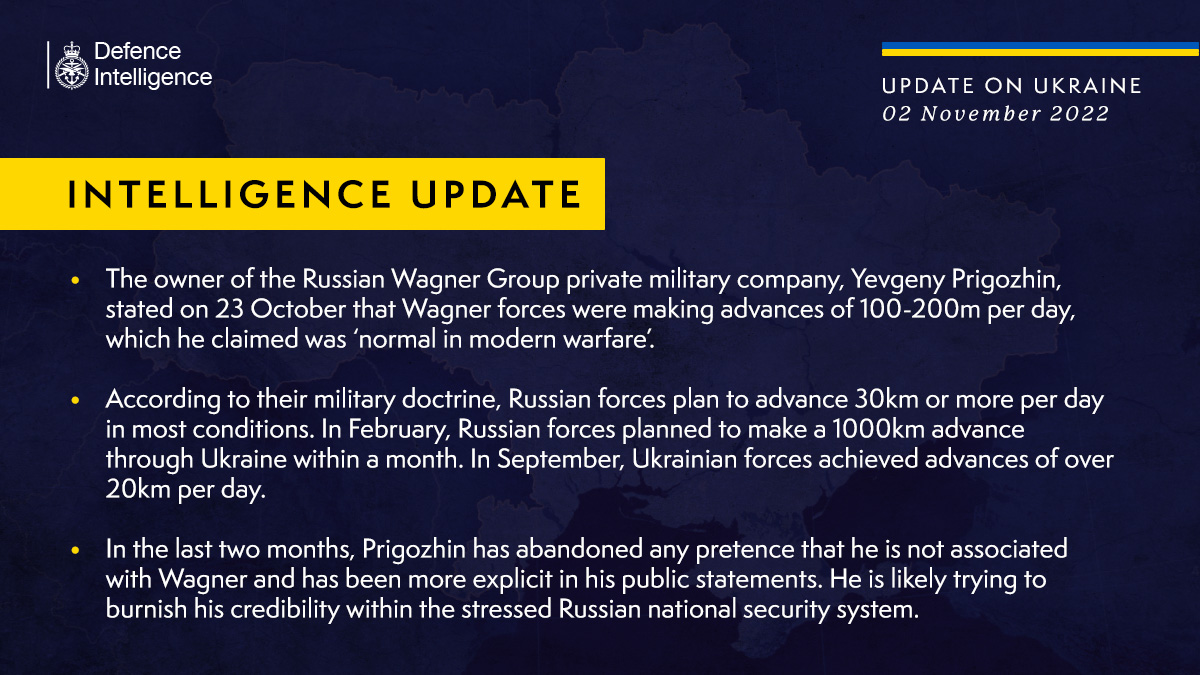 민간군사기업 러시아 와그너 그룹의 수장인 예브게니 프리고진(Yevgeny Prigozhin)은 10월 23일에 밝힌 내용에서 와그너의 군대는 매일 100~200미터의 전진을 하고 있으며 이는 '현대전에서 정상적인 수준'이라 주장하였다.