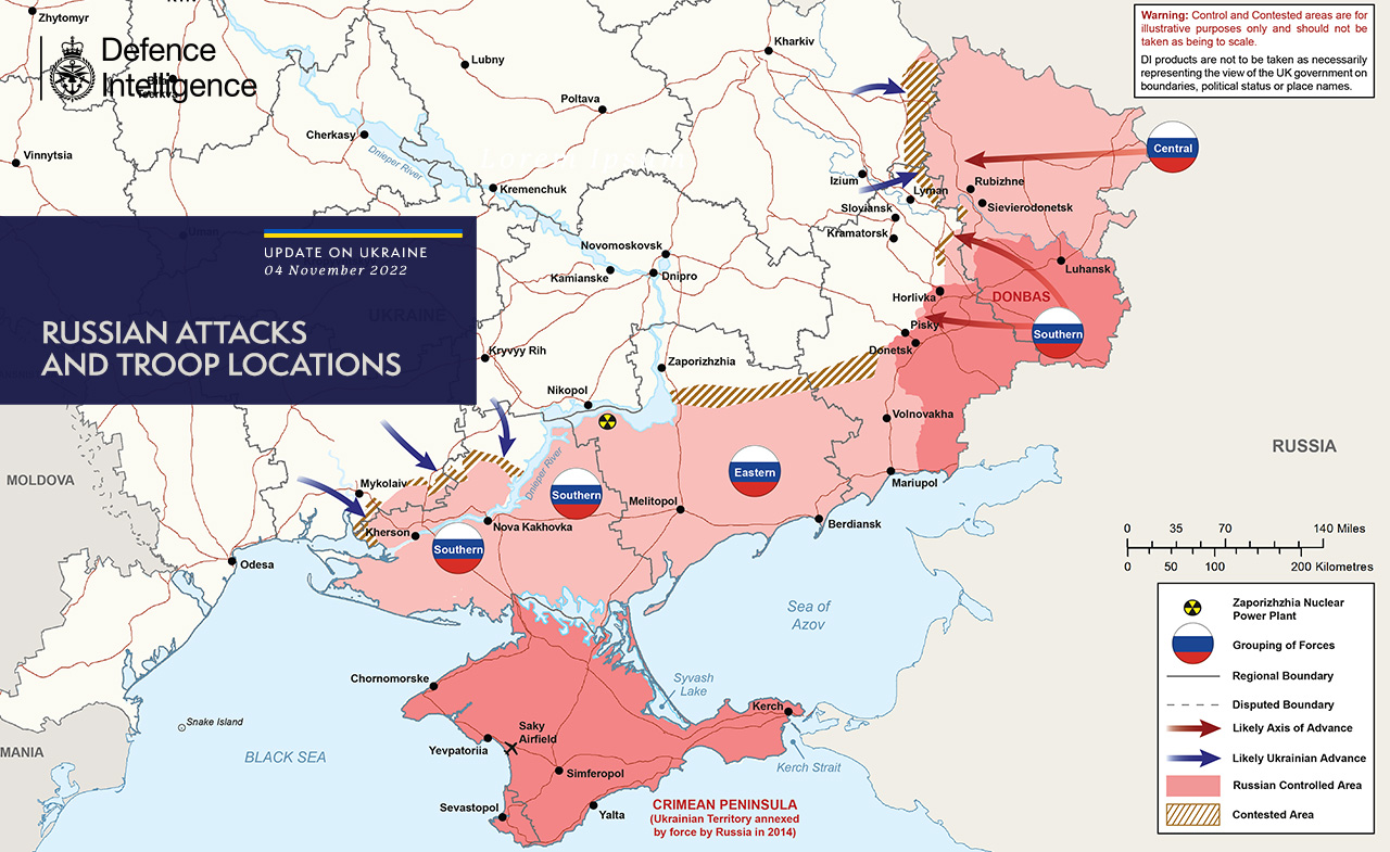 Due to low morale and reluctance to fight, Russian forces have probably started deploying "barrier troops" or "blocking units". These units threaten to shoot their own retreating soldiers in order to compel offensives and have been used in previous conflicts by Russian forces.