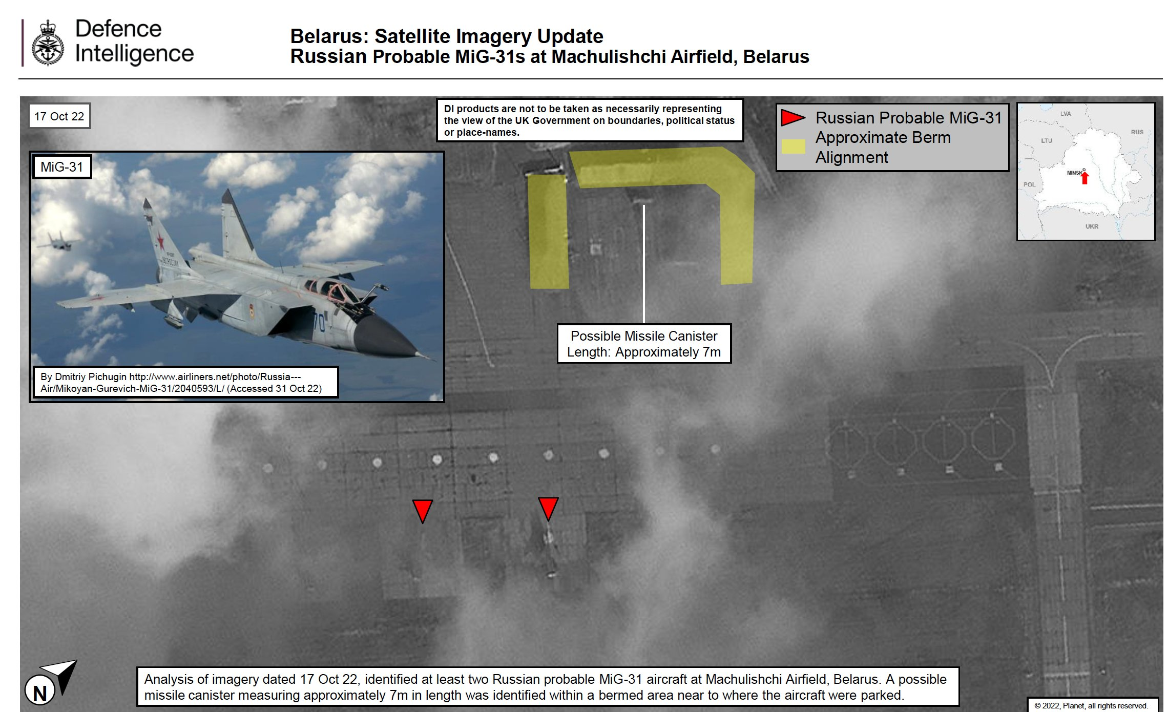 이미지를 보면, 10월 17일에 두 대의 MIG-31K FOXHOUND 요격기가 벨라루스의 마추리쉬키(Machulishchi) 비행장에 주기되어 있고, 근처의 보호용 흙막이(protective earth berm) 안에 대형 캐니스터가 있었던 게 거의 확실해 보인다. 이 캐니스터는 MIG-31K에 탑재되는 AS-24 KILLJOY 공중 발사 탄도 미사일 (Kh-47M2 킨잘 미사일로도 알려져 있음.)과 관련되어 있을 가능성이 있다.