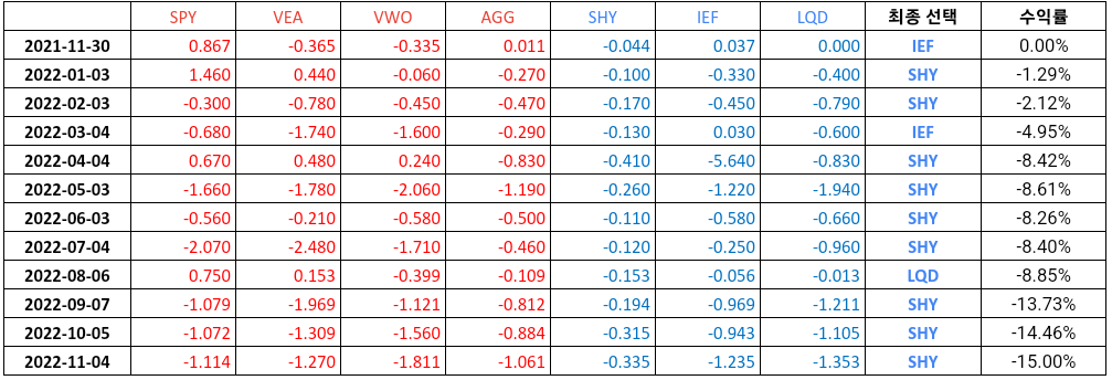 VAA 로직에 따라 수비 자산중 가장 스코어가 높은 SHY (1~3년 미국 단기채)가 결정되었습니다. 지난 달의 판박이네요.