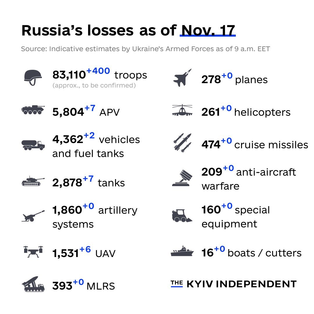 * 우크라이나군이 추산한 러시아군의 인력 손실(전사, 항복 등)이 83,110명을 기록함 (키이우 인디펜던트)