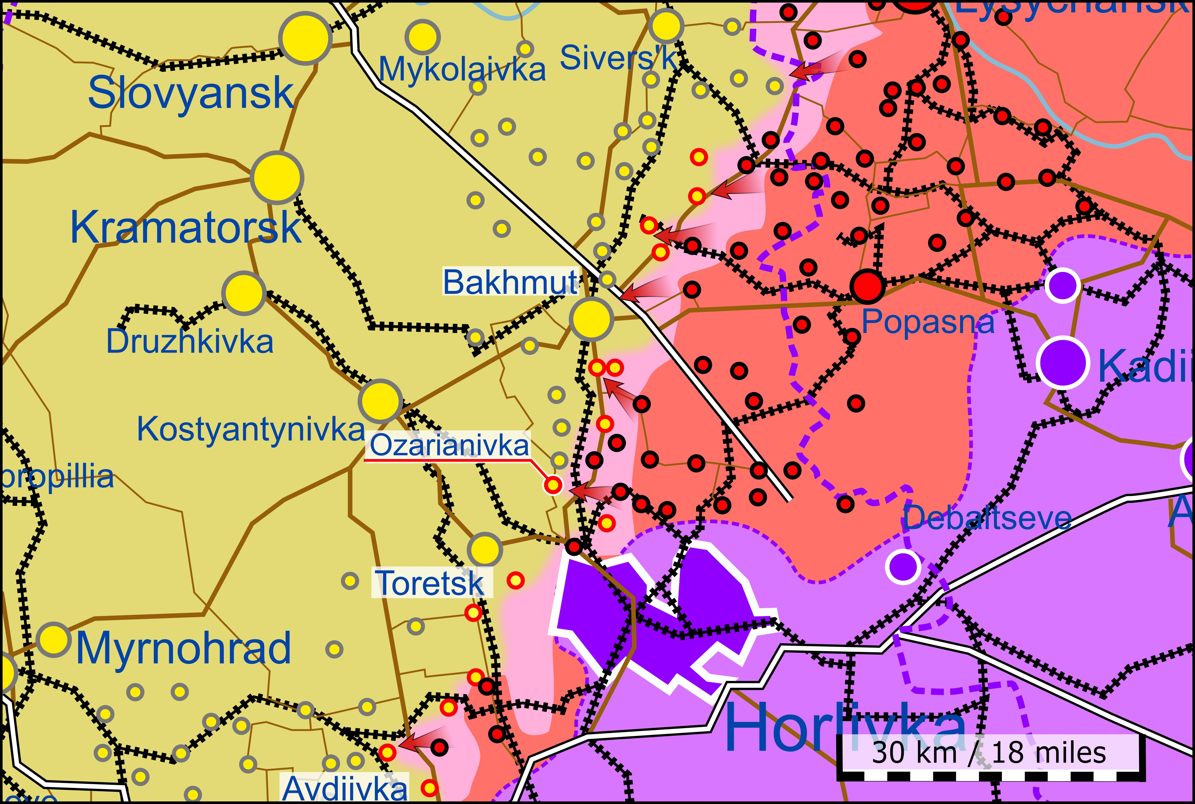 - 바흐무트(Bakhmut)의 남쪽에서 러시아군이 오자리애니브카(Ozarianivka)의 정착촌을 공격하고 있음.