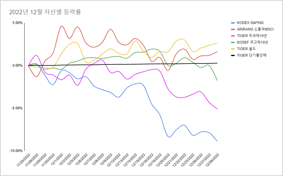 이번 달에는 금(+2.64%)과 신흥국 주식(+1.64%)이 지난 달에 이어 두 달 연속 상승세를 보였습니다.