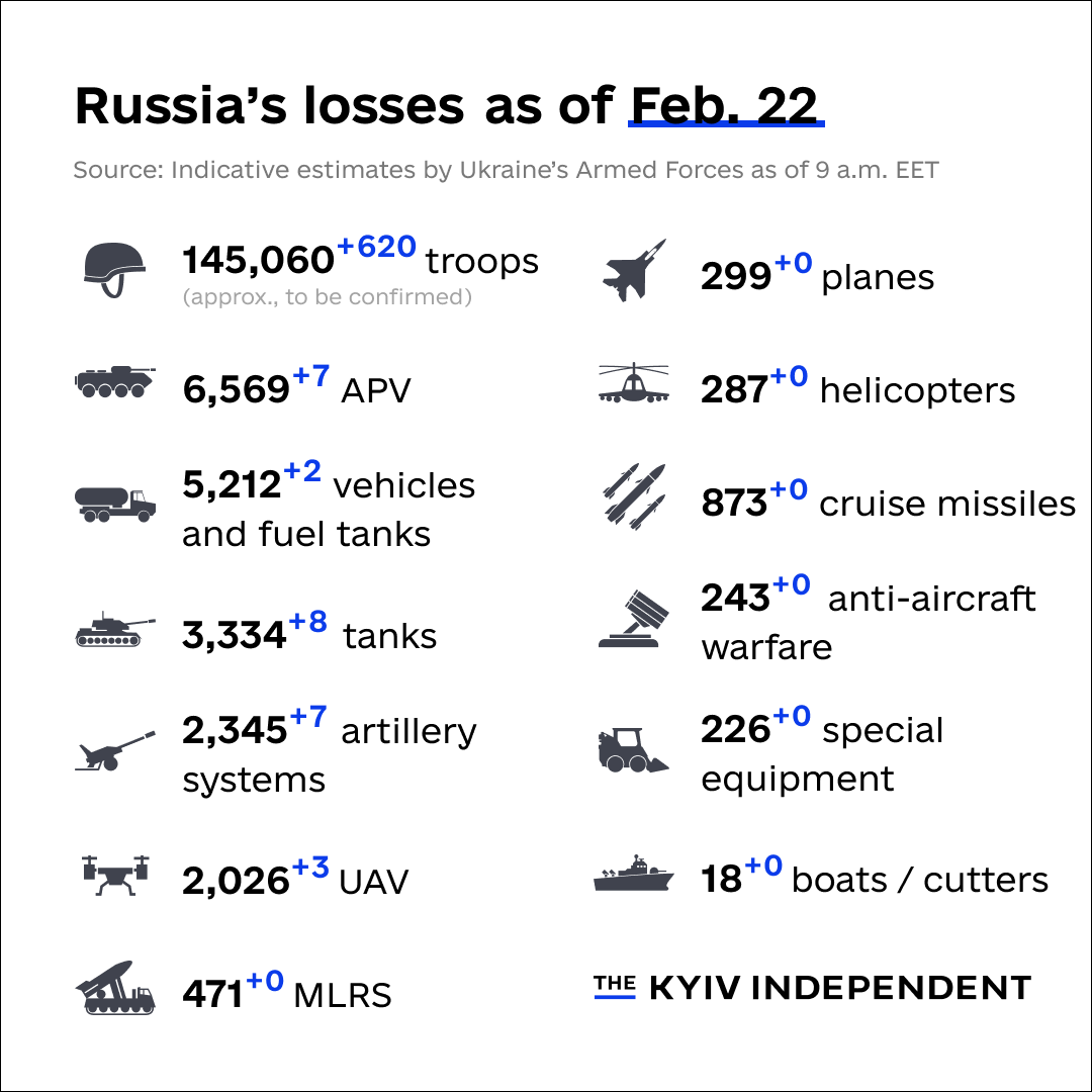 * 우크라이나 군이 추산한 러시아군의 누적 병력 손실 (전사, 항복 등)이 145,060명을 기록함. (키이우 인디펜던트)