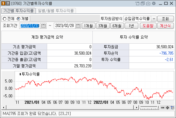 현재까지의 수익률입니다. 지난 달 -1.32%에서 손실이 다시 조금 늘어 -2.61%를 기록했습니다.