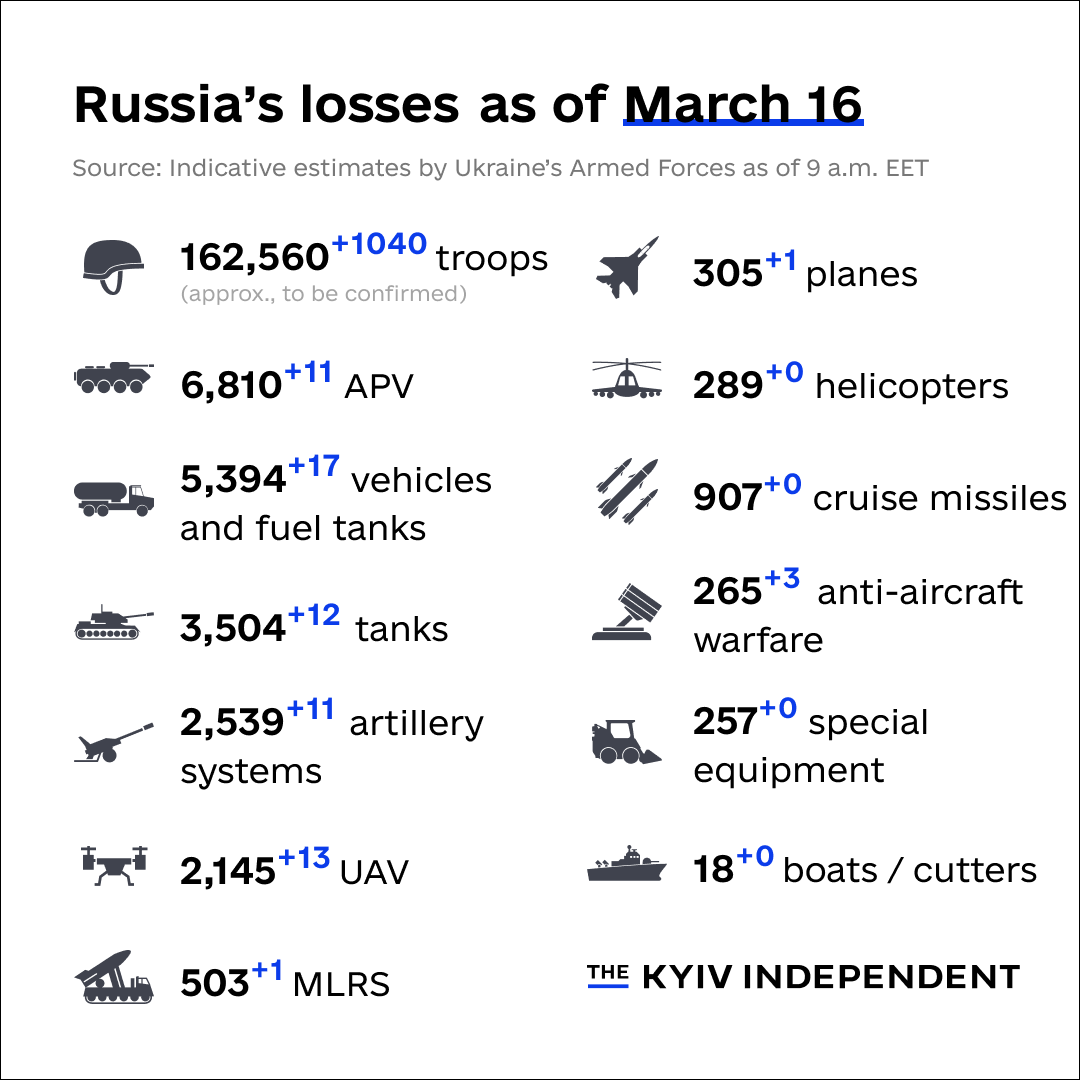 (키이우 인디펜던트) 우크라이나 국방부가 추산한 러시아군 전사자가 16만 2,560명을 기록함. (전일 대비 약 천 명이 증가)