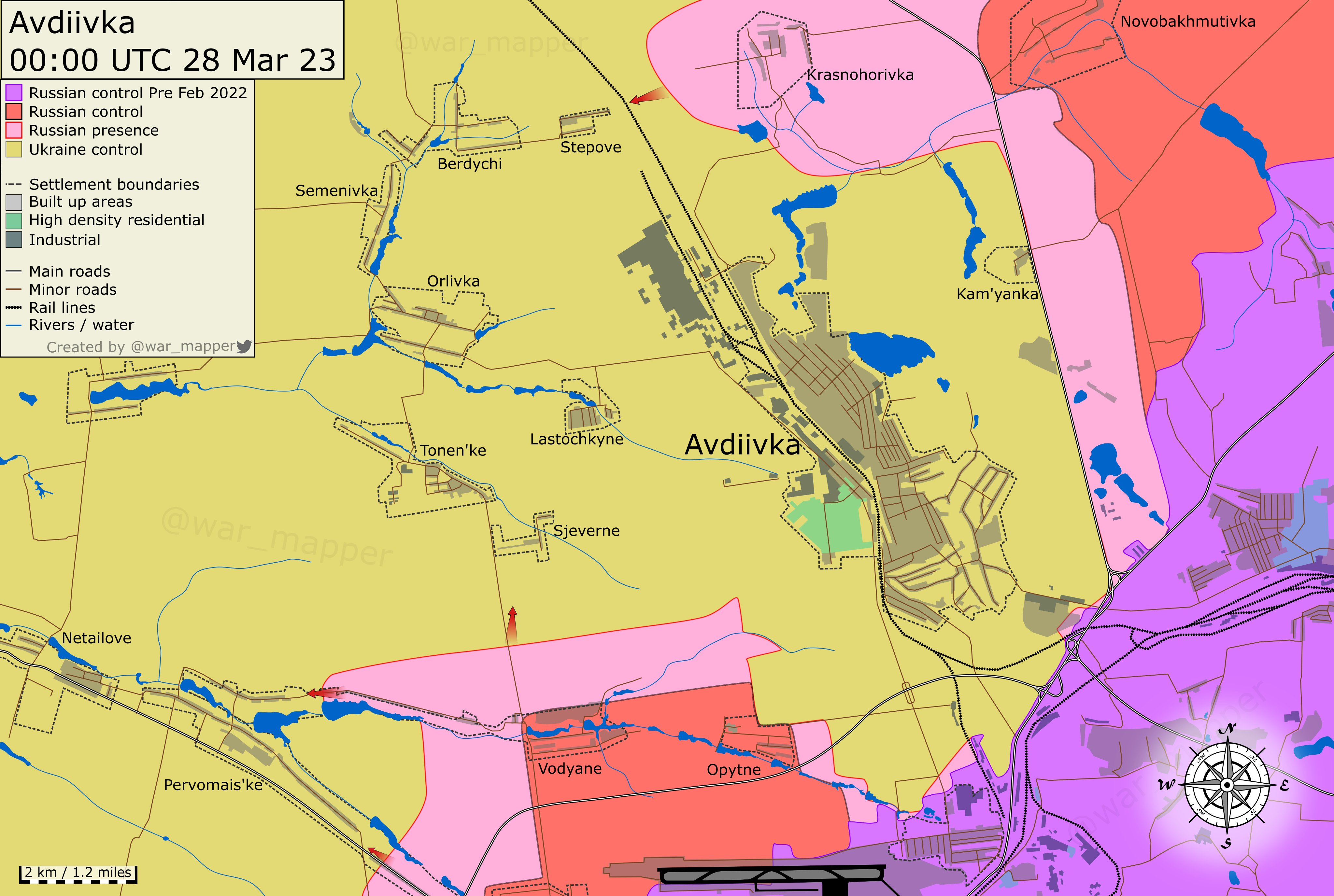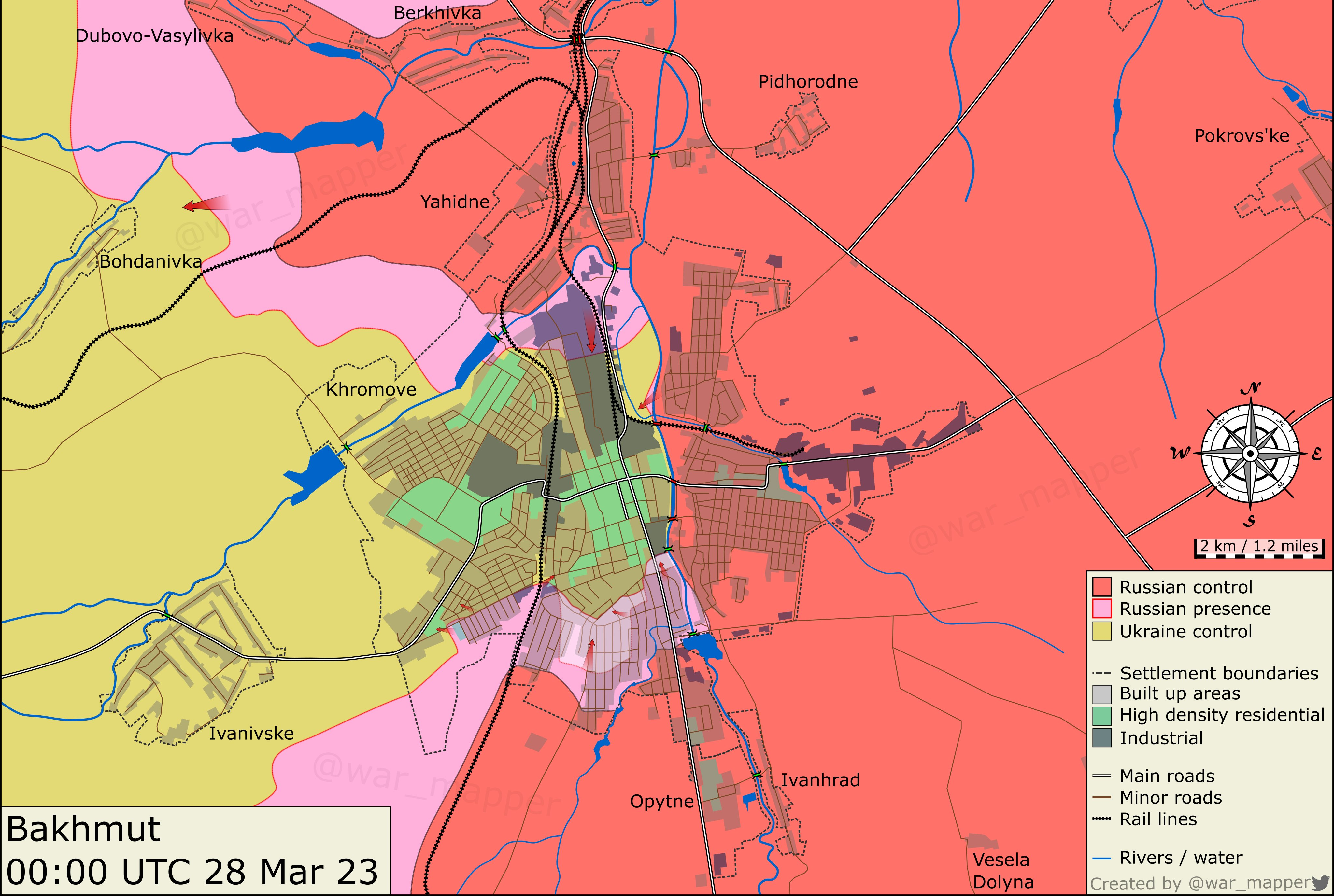- 3월 26일: 러시아군이 도시 남쪽에서 전진하여 2022년 2월 이후 우크라이나군이 점유하고 있는 방어선을 점령하였습니다.