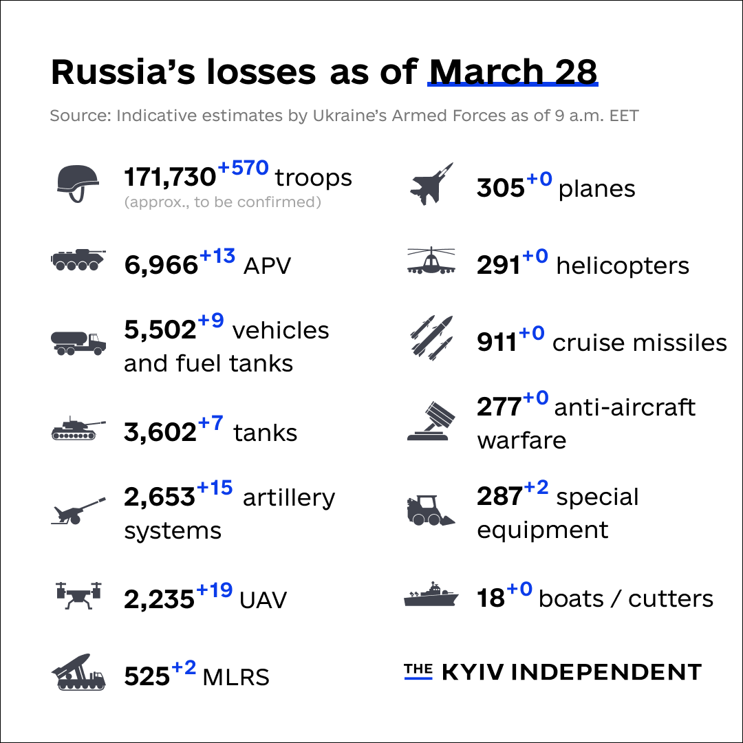 - 3월 28일: 러시아군은 강을 따라 도심을 향해 전진할 뿐만 아니라 더 많은 남부 지역을 확보하면서 남쪽으로 진출을 계속했습니다.