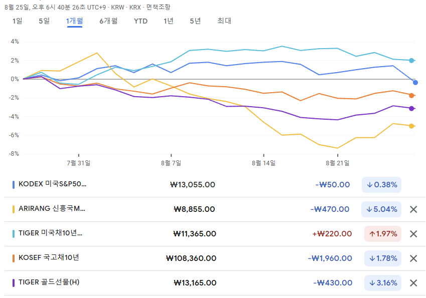 아래는 구글 파이낸스(www.google.com/finance)에서 가져온 지난 한 달 간의 각 자산의 등락률 그래프입니다.
