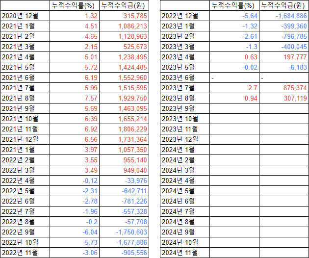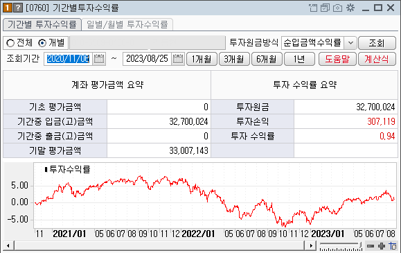 현재까지의 수익률입니다. 지난 7월 2.7%에서 조금 하락하여 0.9% (30만원)를 기록했습니다.