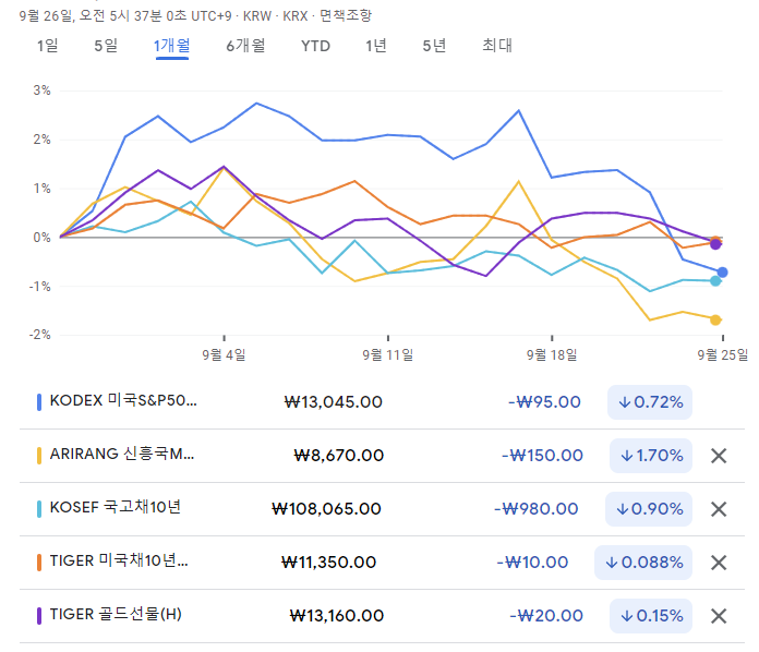 아래는 구글 파이낸스(www.google.com/finance)에서 가져온 지난 한 달 간의 각 자산의 등락률 그래프입니다.