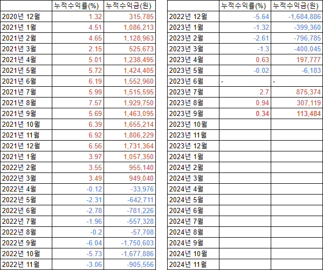 | 2023년 11월 연금저축펀드 수익률 현황 (운용 1,109일째) (0) | 2023.11.28 |