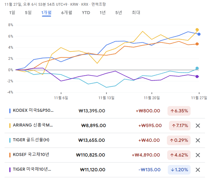 아래는 구글 파이낸스(www.google.com/finance)에서 가져온 지난 한 달 간의 각 자산의 등락률 그래프입니다.