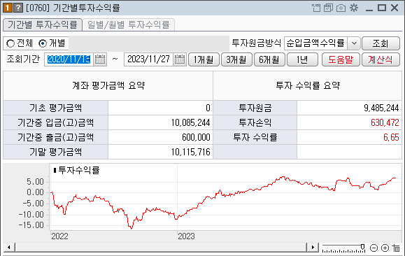 현재까지의 수익률입니다. 지난 달 -1.2% (-40만원)에서 플러스로 다시 전환하여 6.65%(+63만원)을 기록했습니다.