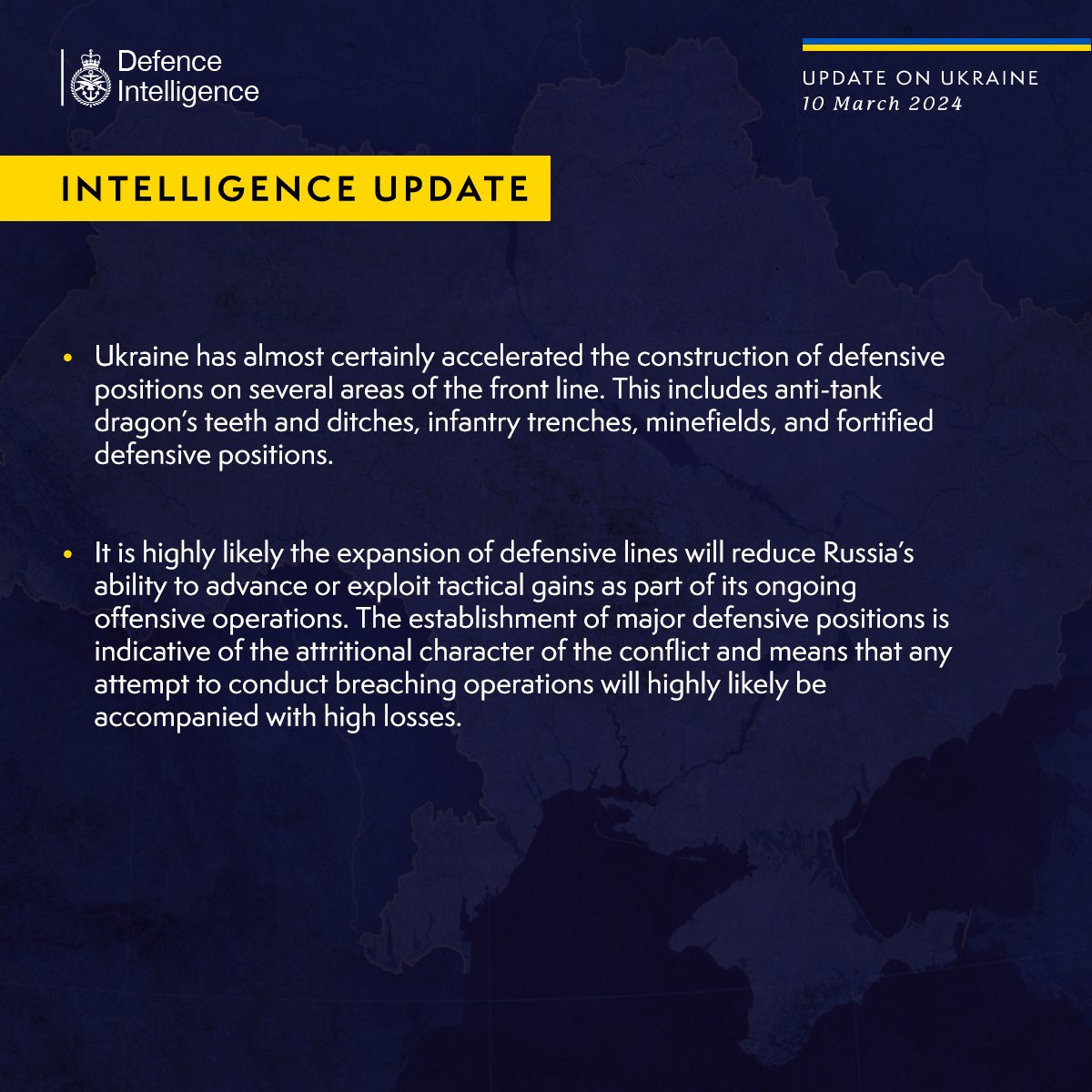 Latest Defence Intelligence update on the situation in Ukraine – 10 March 2024. Find out more about Defence Intelligence's use of language: https://t.co/PS5XNUKusV #StandWithUkraine 🇺🇦