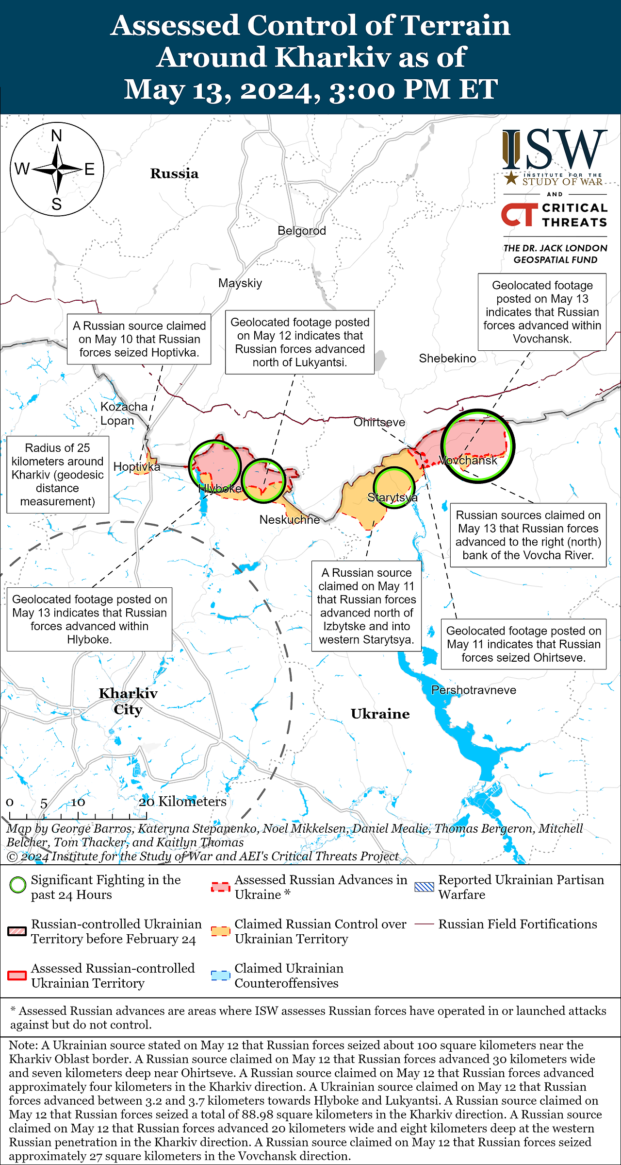 러시아군은 5월 13일 하르키우(Kharkiv) 시의 북부와 북동부에서 전술적으로 상당한 진전을 이어갔으며 국경을 따라 빠르게 "완충 지대"를 만드는 것에 우선순위를 두고 있는 것으로 보인다. 이는 하르키우 주로 더 깊은 침투를 하기 위한 조건들을 만들어 가고 있는 것이다.