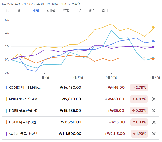 모든 자산이 상승했습니다. 특히 미국 주식과 신흥국 주식이 많이 올랐는데, 특이하게 국고채도 꽤 많이 올랐네요.