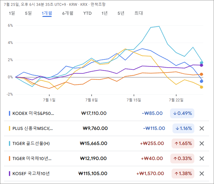 구글 파이낸스(www.google.com/finance)에서 가져온 지난 한 달 간의 각 자산의 등락률 그래프입니다.