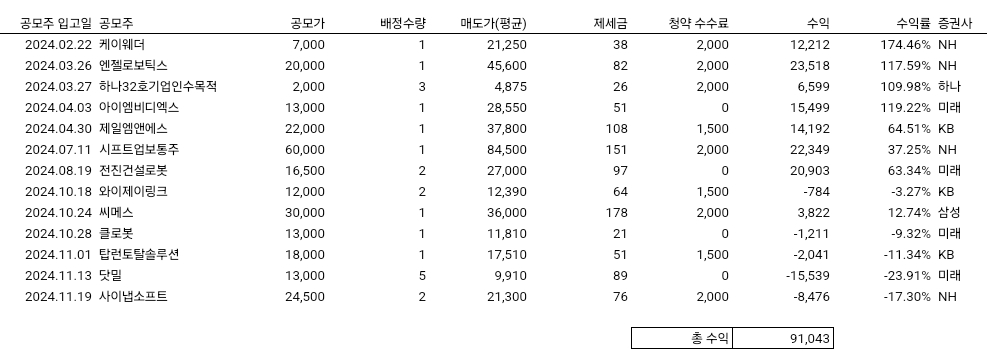 2024년 공모주 청약 순익은 91,000원으로 마무리 하려 합니다. 그래도 손해가 나지 않은 것에 위안을...